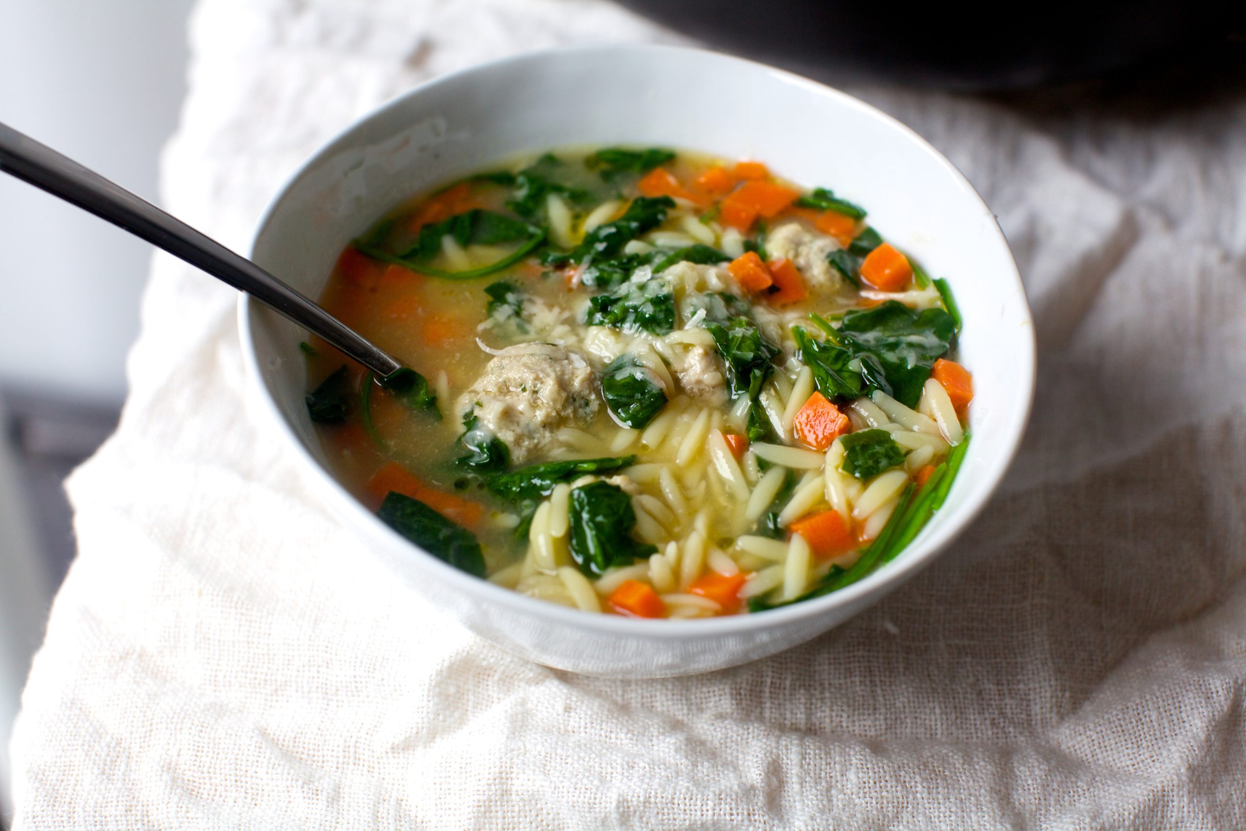 Seeing as I am a sucker for anything with the word “wedding” in it, be it an excuse to smash cake in someone’s face, bake cookies or in this case, put meatballs in soup. Of course, traditional Italian Wedding Soup (also known as Minestra Maritata or Pignato Grasso) is said to have little to do with happily ever afters, but the marriage between meat and vegetables in a soup. Associated with southern Italy, but more often parts of the Northeast, most recipes today have pork, a leafy green and some form of pasta in it, typically tiny ancini de pepe confetti. This soup is a quick riff on that, with turkey meatballs so good, I’d encourage you to make extra to serve with a future spaghetti dinner, escarole (though unable to find it, I used swiss chard), orzo and carrots in chicken stock.