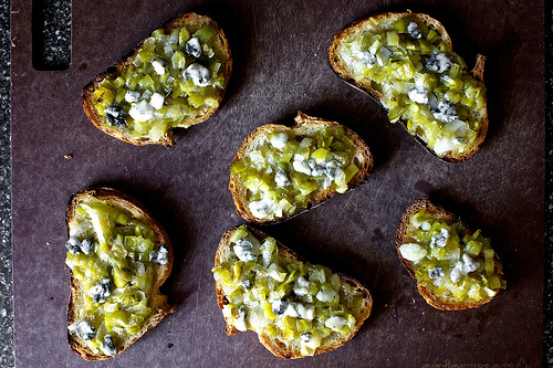 leek toasts with blue cheese
